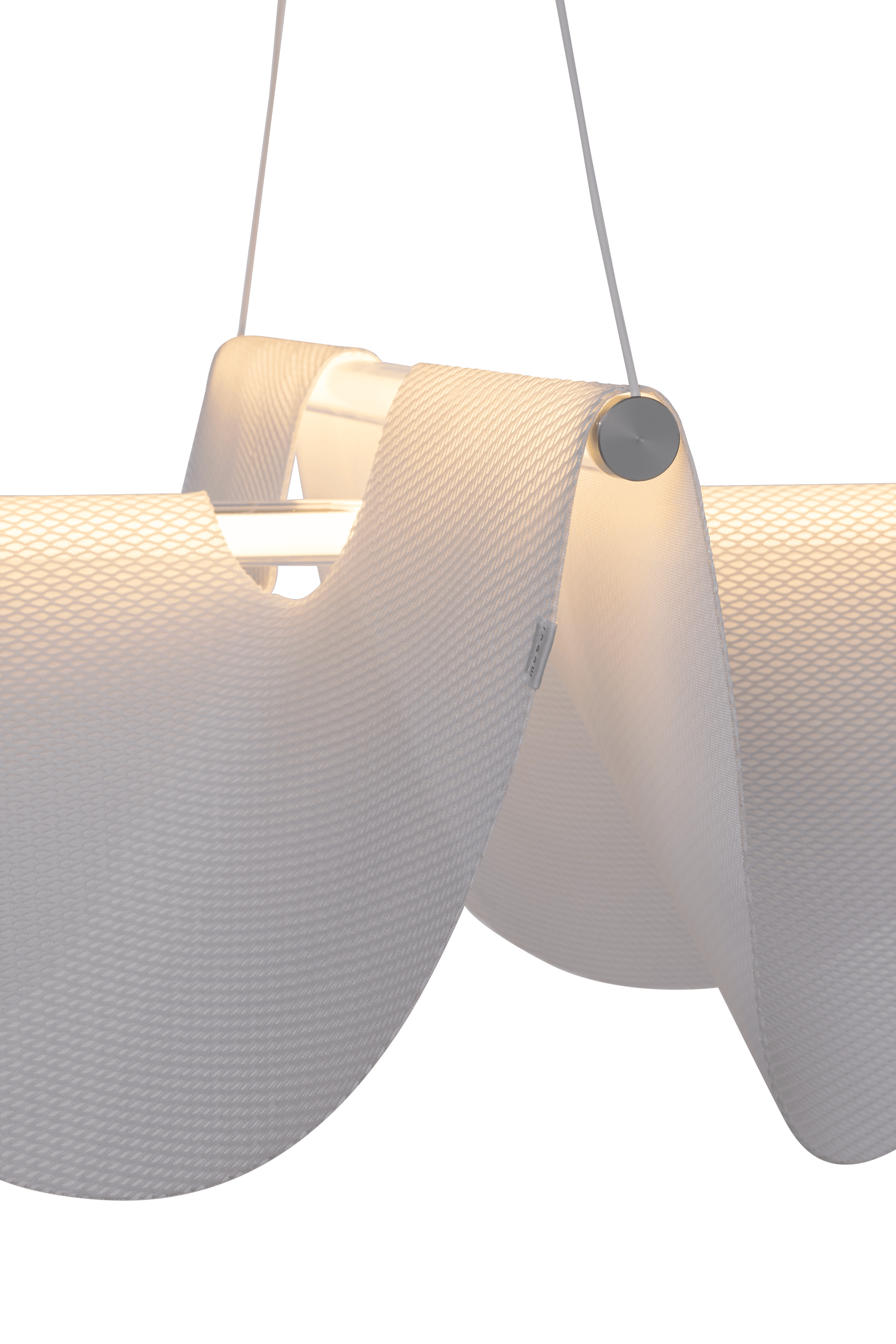 Shaped by gravity, the 3D-knitted polyester fabric rests on a minimal frame of two glass tubes encapsulating LED lights.