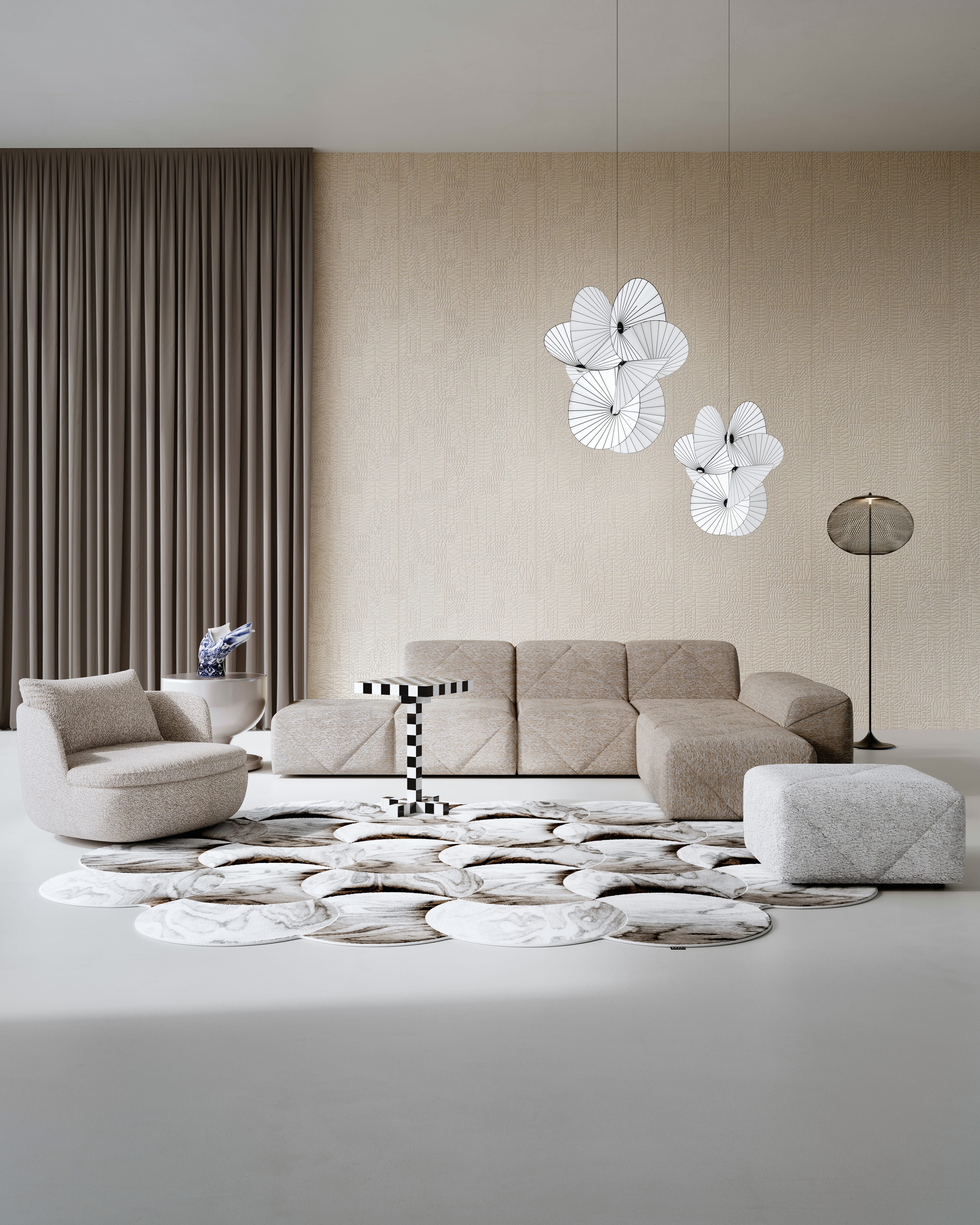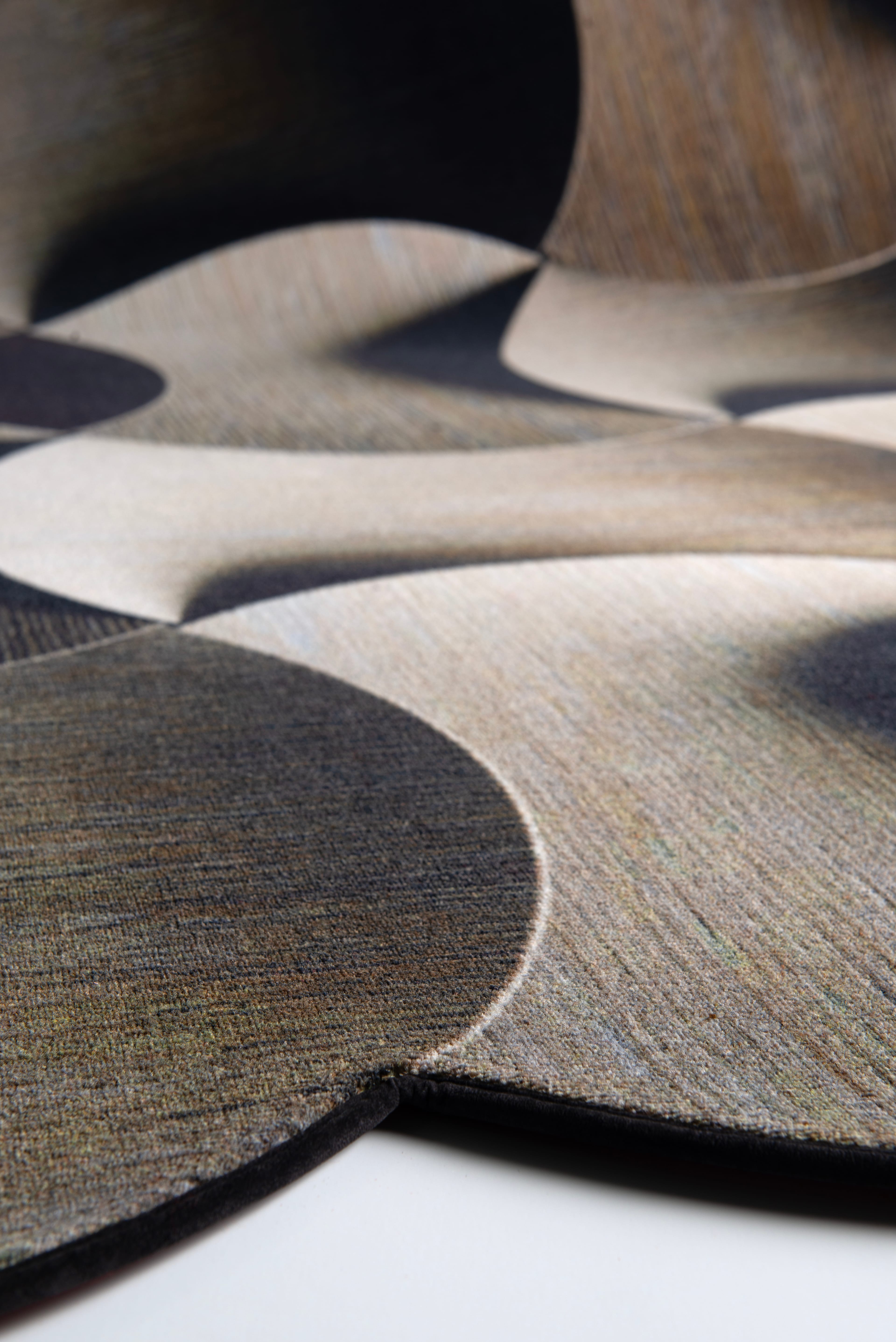 Timber Tones by Sjoerd Vroonland for Moooi Carpets honours the timeless beauty of wood. In collaboration with FineMarq, classic wood inlay techniques are reimagined with modern methods. Intricate geometric patterns mimic the natural flow of grain, creating art underfoot that fills any space with warmth and enduring sophistication.