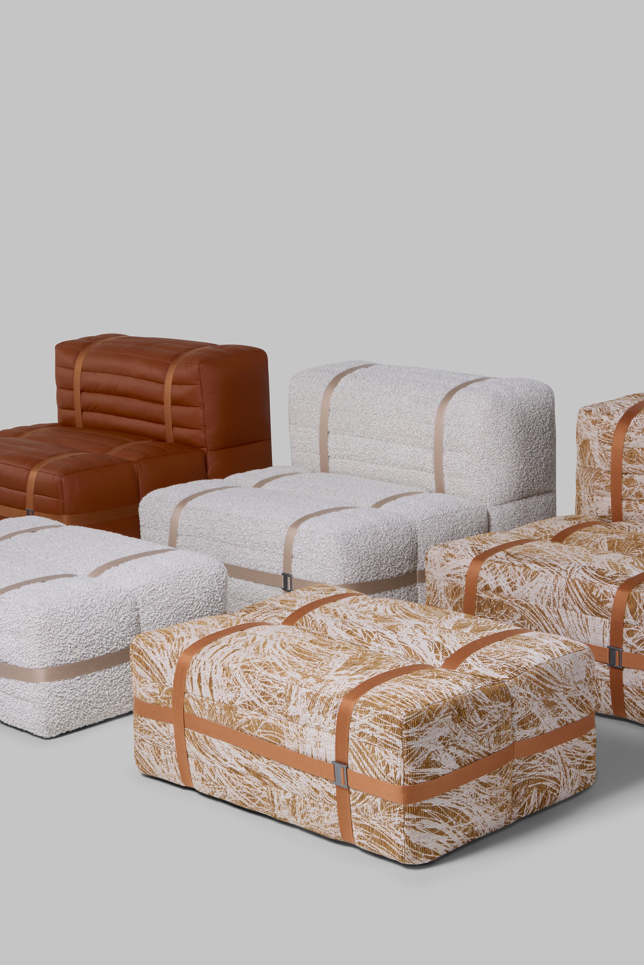 Soft, quilted cushions meet bold, industrial straps in a dialogue of texture and strength. Every element is developed with care: the luxurious upholstery embraces you like a cherished memory, while the striking details hint at the hardworking practicality of farm life. Paired with a matching Footstool, the modular design adapts effortlessly, creating intimate spaces and dynamic living areas alike.