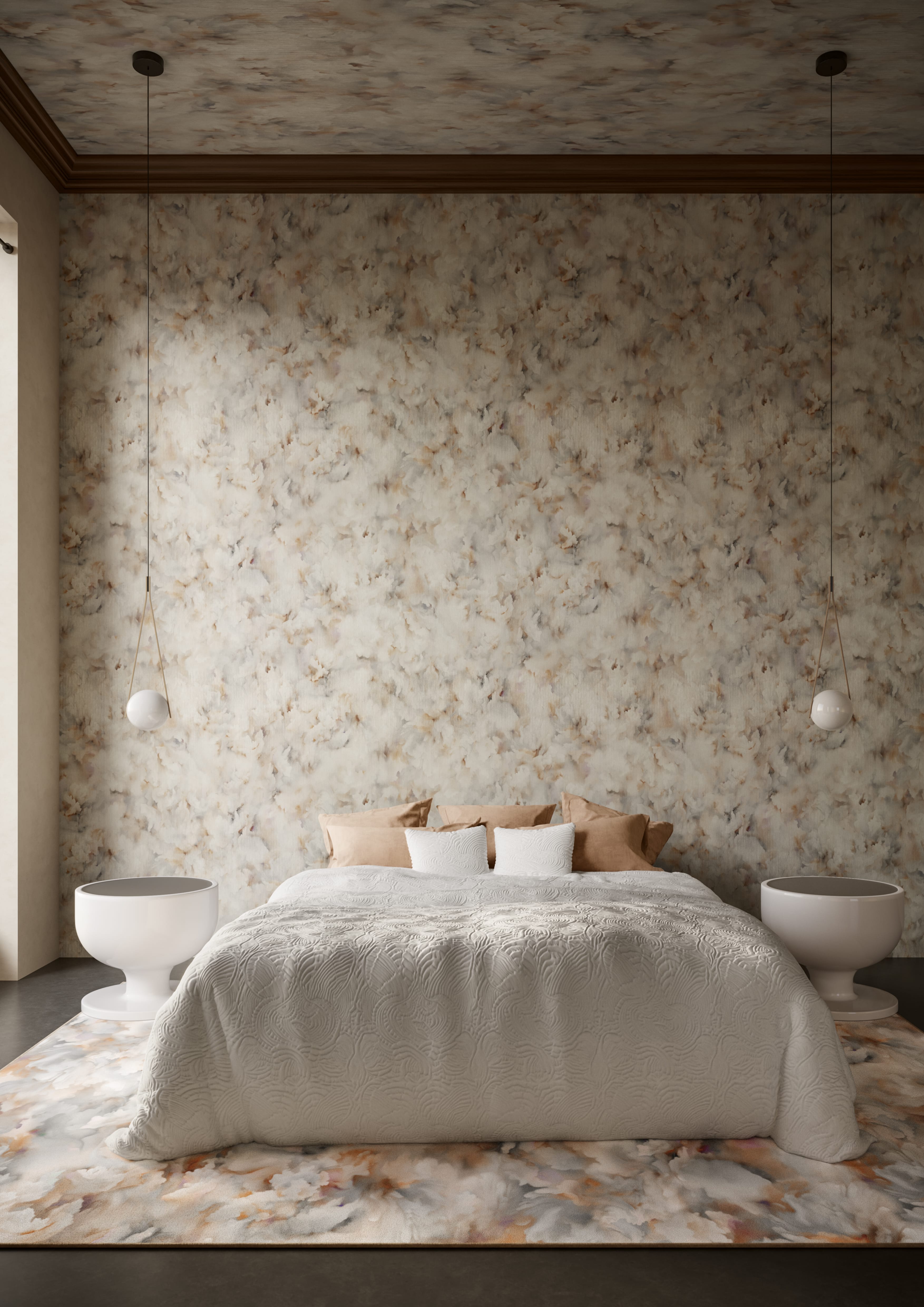 The Wallcovering features abstract floral patterns reminiscent of watercolour-style petals. The design displays the tactile quality of raw silk, presenting a colourful fil-à-fil composition in soft neutral and pastel hues.