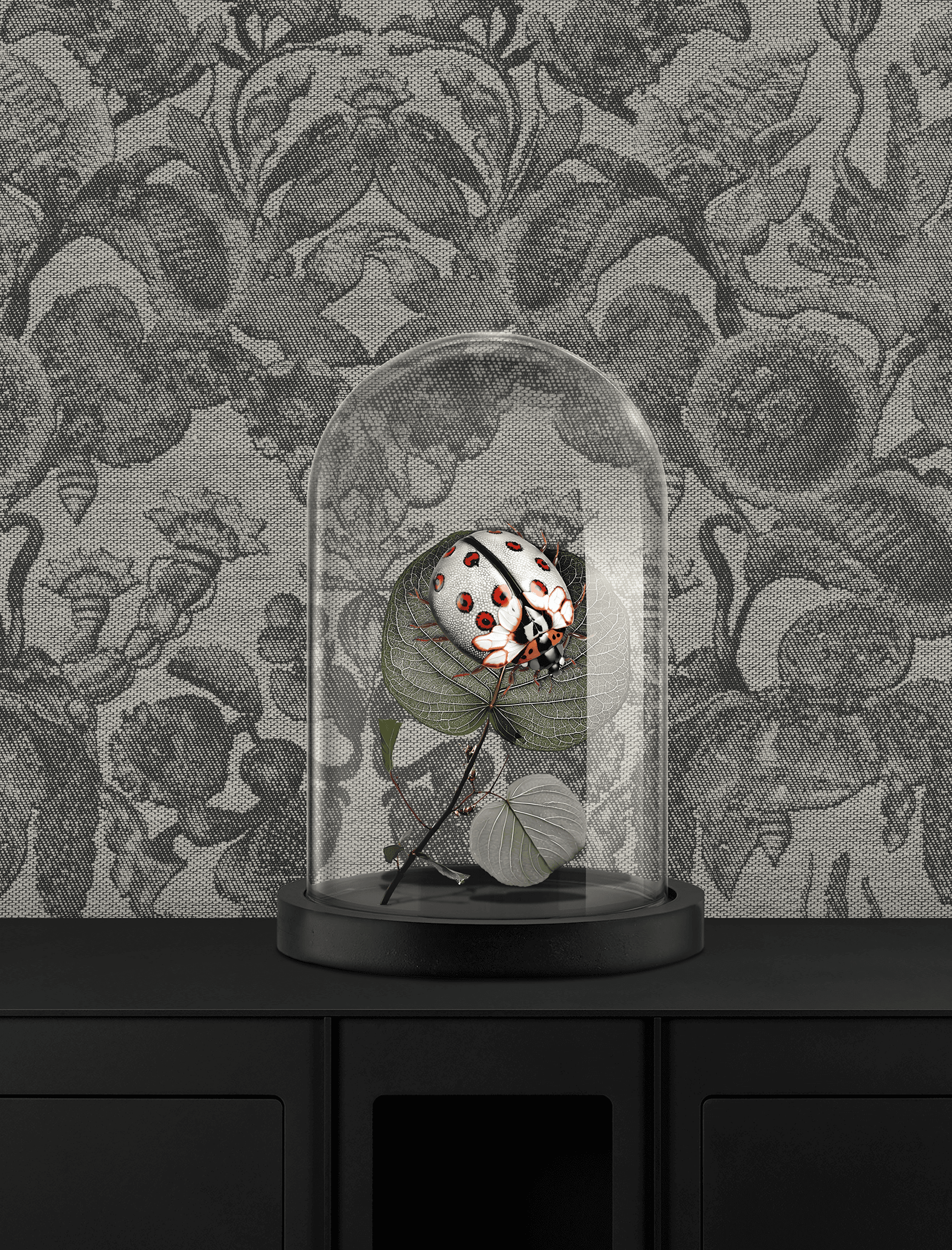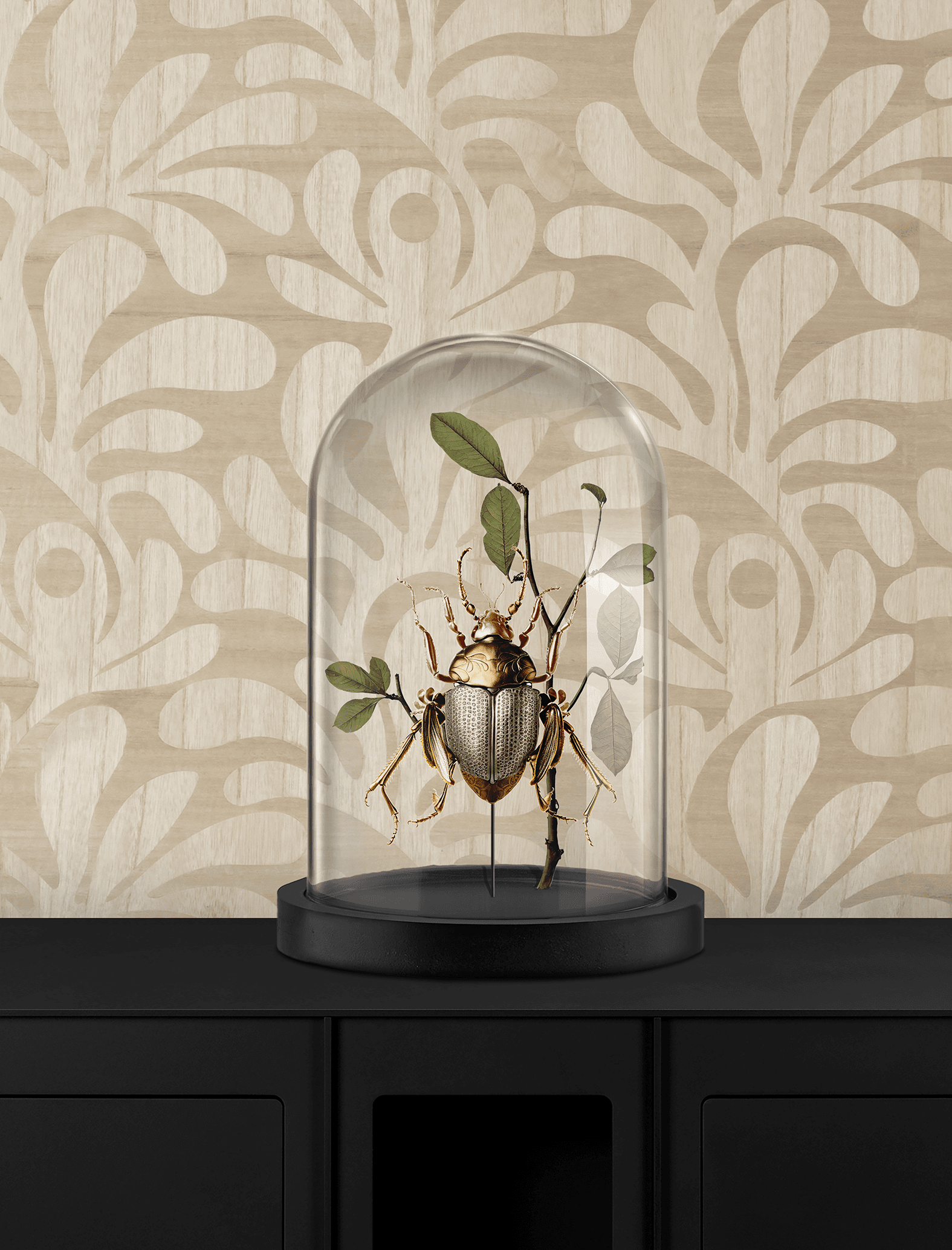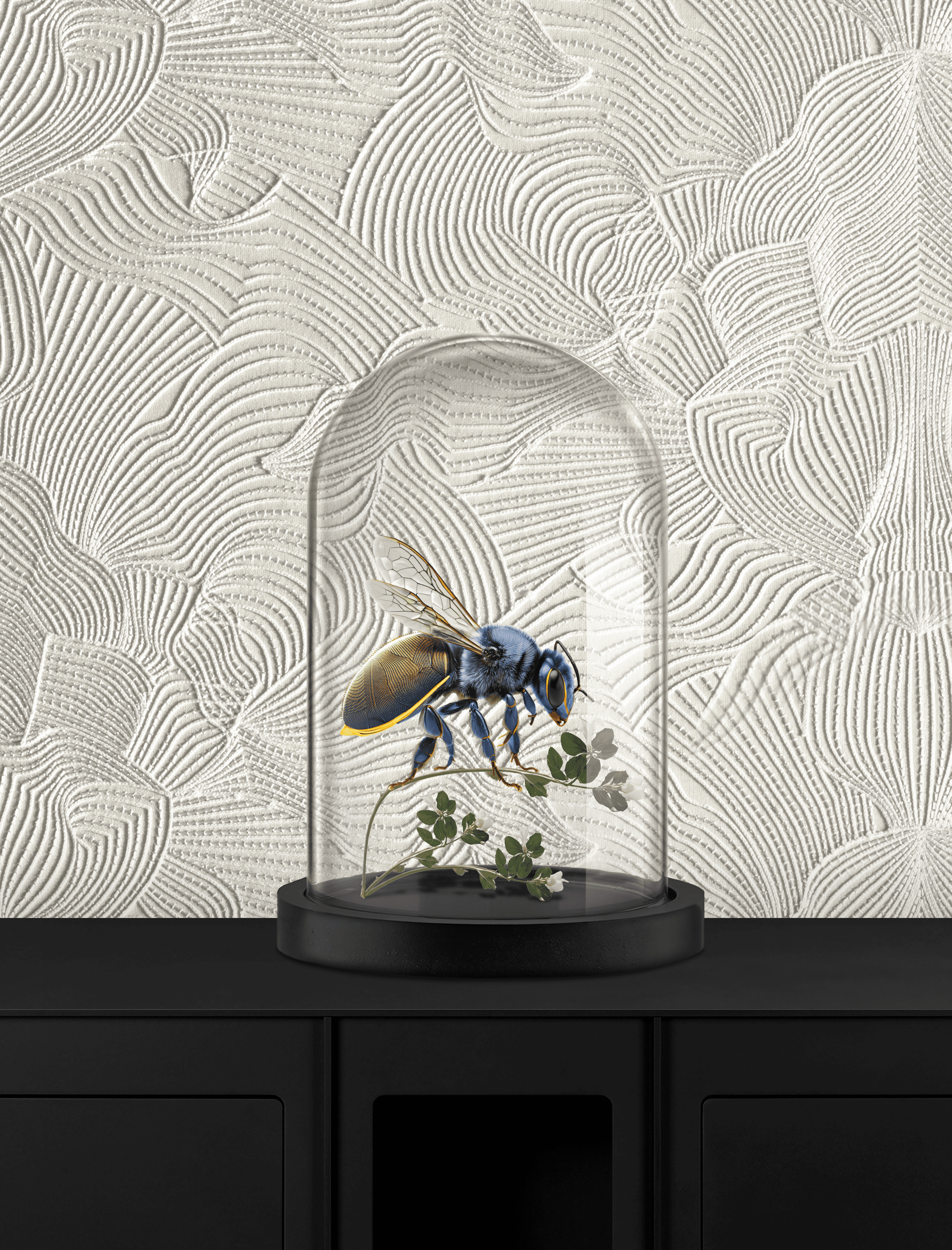 The Wallcovering is a stunning 3D effect motif that draws inspiration from decorative moulding. The design imitates the sensation of peering through the glass panels of a greenhouse, uncovering the mesmerising marvels of lush flowers and hidden creatures moving through a lush landscape.