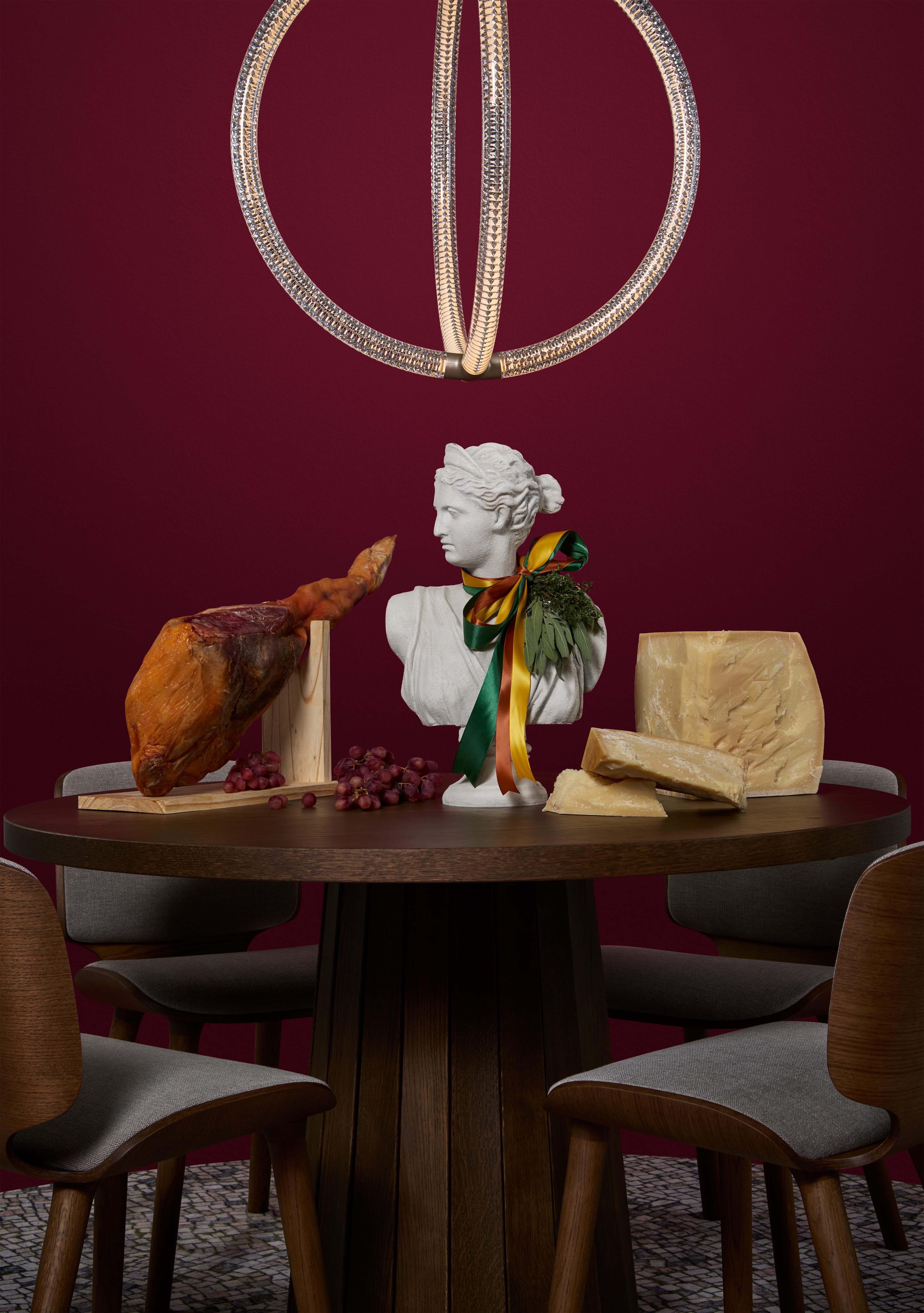 Step into a world of timeless elegance with Venetian Splendour. Deep burgundy tones meet Italian charm with the dark-stained Container Table and Nut Dining Chairs as centrepieces. A mosaic-patterned carpet adds storied flair, while the Luminora Light casts a warm glow over aged cheeses, cured meats and fresh grapes.